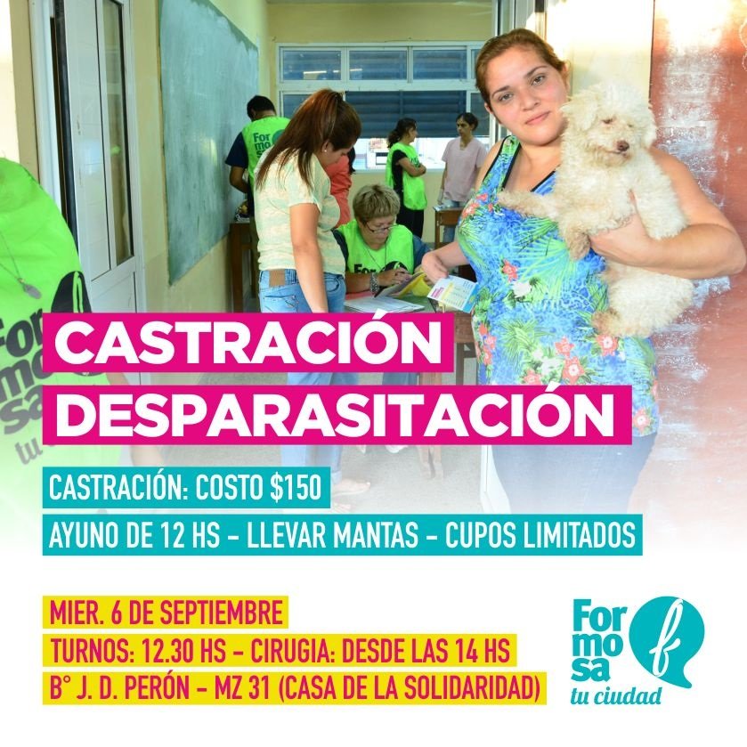 El servicio de vacunación, desparasitación y castración, estará disponible este miércoles 6, desde las 14 horas, en la Casa de la Solidaridad del barrio Juan Domingo Perón, en la manzana 31, y el fin de semana se presentará en el Operativo Provincial "Por Nuestra Gente, todo.